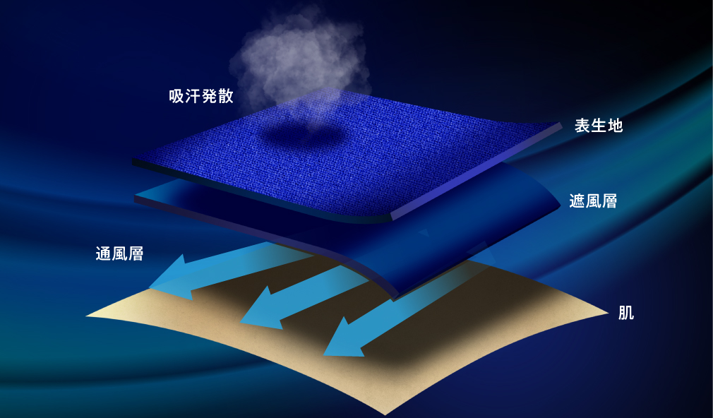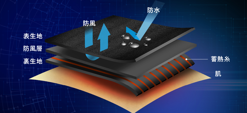 - 防風層が冷たい風を防ぐ